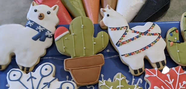 We offer sets of a half dozen cookies in various themes (holidays, birthdays, cats, etc.). These start at $19/set and include a variety of shapes and colors.